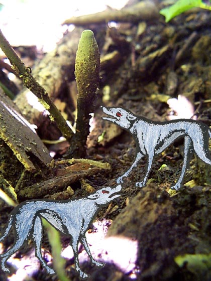 Suddenly, the air in the cave grew thick and stale. A yellow haze hung around him. Poison Pie stopped to catch his breath and was immediately encircled by a pack of vicious hounds of heck. "I must be getting close," Poison Pie thought to himself.
