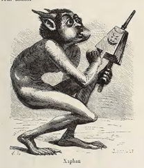 Xaphan, démon du second ordre. Quand Satan et ses anges se révoltèrent contre Dieu, Xaphan se joignit aux mécontents, et il en fut bien reçu, car il avait l'esprit inventif. Il proposa aux rebelles de mettre le feu dans le ciel; mais il fut précipité avec les autres au fond de l'abîme, où il est continuellement occupé à souffler la braise des fourneaux avec sa bouche et ses mains. Il a pour emblème un soufflet.
