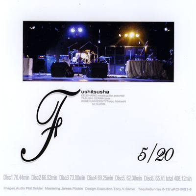 Introduction In addition to Keiji Haino's prodigious output of officially released recordings, he maintains a full schedule of live performances. In 2004, Haino played 78 lives shows, sometimes two in one night at different venues. (See the posted schedule of 2004 live dates for more details.) Of these shows, the majority were in Tokyo, although Haino also performed in other cities in Japan as well as in Australia, France, Taiwan, The Netherlands, Scotland, Sweden, and Austria during 2004. The venues for these shows include festivals, art galleries, clubs, gyms of former junior high schools, and small holes-in-the-wall with a maximum occupancy of 10 (advance lottery determining seating). The line-up for these live performances also varied considerably. Many of the shows in 2004 were solo shows, featuring Haino on acoustic guitar, electric guitar, hurdy gurdy, flute, various electronics (primitive tone generators and modern air synths), sundry stringed-instruments of Middle-Eastern and Indian ethnicity, a wide range of percussion instruments from a conventional drum set to hand-held cymbals and other percussive noise-makers of unknown origin, and, of course, voice. (While he was in Sweden in August, Haino purchased a nyckelharpa, a Swedish traditional folk instrument that is sort of a cross between a hurdy-gurdy and a fiddle, so expect even more instruments to appear.) In 2004, Haino also performed in his ensembles, including Fushitsusha (with Yasushi Ozawa), Vajra (with Mikami Kan and Toshiaki Ishizuka), Sanhedrin (with Tatsuya Yoshida of RUINS and Mitsuru Natsuno), Kikuri (with Masami Akita of Merzbow) and Headrush (with Reck of Friction and Pill). In addition to these named ensembles, Haino performed in 2004 with numerous experimental and avant garde musicians in a free music mode. These musicians include some immediately recognizable names such as Otomo Yoshihide, Makigami Koichi, Munehiro Narita of High Rise and Masatake Fujikake of Zeni Geva , as well as more than a dozen others with names familiar mostly to followers of Japanese free music. These musicians accompanied Haino on sitar, drums, guitar, electronics, voice, cello, saxophone, violin, piano, and bass. In August, Haino even played with crickets (yes, the insects). With such a diverse group of instruments and collaborators, no two Haino shows are alike. Moreover, many of the collaborations have never been documented on official releases. As a result, for those who cannot get enough of Haino through the official releases, there are live shows, and for those outside of Tokyo there are recorded live shows. Haino has always been very tolerant of audience members recording his live performances. Most of these recordings end up as simple cdrs, labeled with markers and slipped in a paper sleeve, passing between ardent (obsessed?) Haino fans in the relatively small live-show trading community. However, recently a new label, aRCHIVE, has sprung up and has unofficially released a finely packaged document of a Keiji Haino live show. This release (produced in a limited edition of twenty) was never for sale and was given away to Haino & friends in the live-tape trading community. This document contains an epic seven hour performance of Fushitsusha at Hosei University in Tokyo on December 13, 2003. This product features spectacular packaging, such as has never before been seen on a bootleg recording. It is simply a celebration of Haino's music crafted by several individuals who have long had a great interest in the music. Fushitsusha Personnel: Keiji Haino (vocals, guitar) Yasushi Ozawa (bass) Venue: Hosei University, Tokyo, Iidebashi Date: December 13, 2003 sound quality: excellent, digital comments: numbered limited edition of twenty label: Tequila Sunrise/aRCHIVE catalog number: Tequila Sunrise 6-12/aRCHIVE 1-6 format: 6xcd