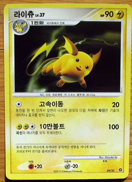 Raichu Theme Deck Featured Pokémon: Raichu Number of cards in Deck: 30 Pokémon types: electric, water & normal Cards are taken from Korean Series 1 Theme Decks. This deck was available in two formats: as a boxed deck and as a bundle with the Red Gyarados promo card. The deck contained some fixed cards and some random sets of cards. A couple examples are shown below. The first listing is from the boxed format. The second listing is from the bundle. Symbol: ![]()