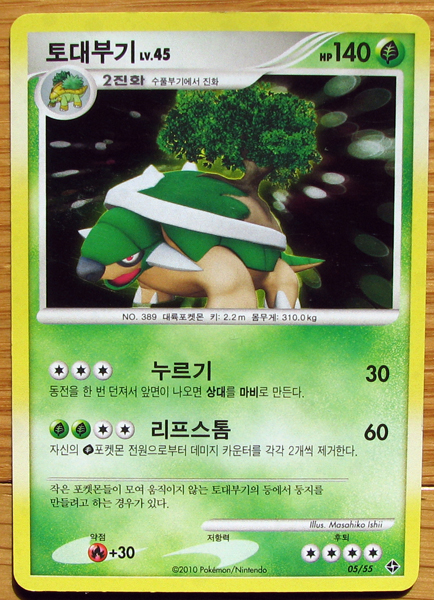 Torterra Theme Deck Featured Pokémon: Torterra Number of cards in Deck: 30 Pokémon types: grass & normal Cards are taken from Korean Series 1 Theme Decks. This deck was available in two formats: as a boxed deck and as a bundle with the Red Gyarados promo card. The deck contained some fixed cards and some random sets of cards. A couple examples are shown below. The first listing is from the boxed format. The second listing is from the bundle. Symbol: ![]()