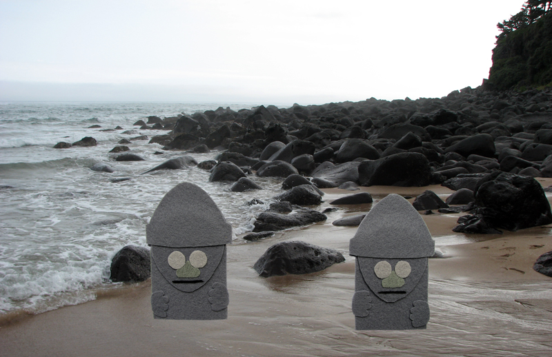 Our heroes booked passage to Jeju. Soon, the island drew near. Sure enough, as they disembarked from the ship, they were confronted by two Dolharubang, herding rocks on the beach. The grandfathers fixed the visitors with a stony gaze.