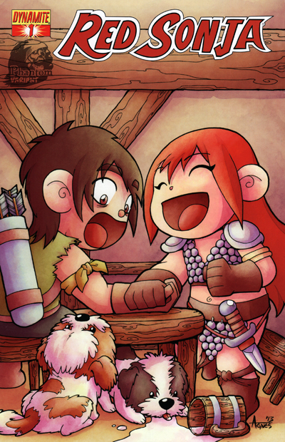 - commentary: For the debut issue of the Gail Simone retelling of Red Sonja, Agnes Garbowska created a cover, exclusive to Phantom Comics, showing off Red Sonja's strength of arm. The puppies lapping up the milk, spilled as a result of this tavern brawl, are a special touch.