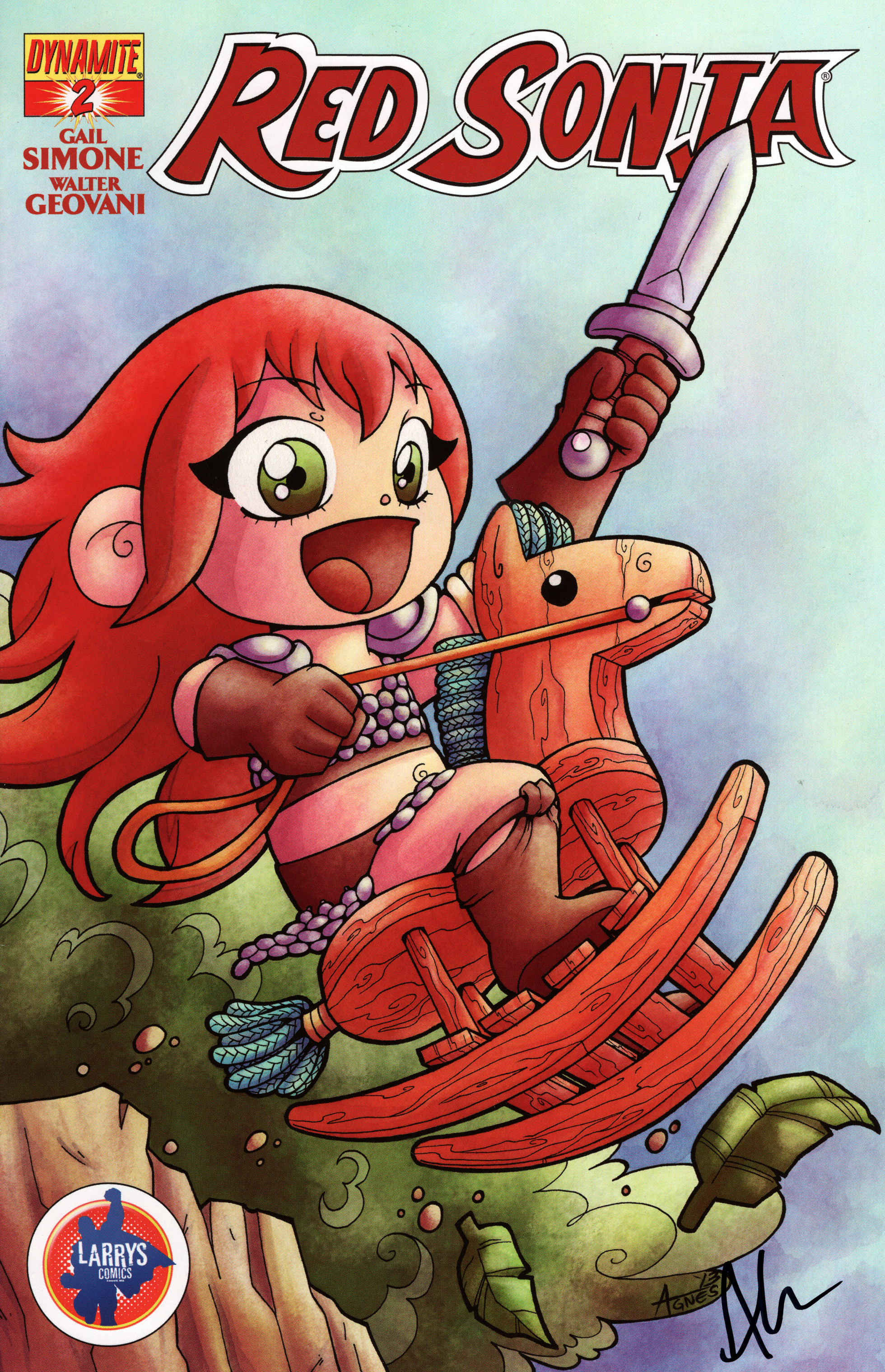 - commentary: For the second issue of the same series, Agnes Garbowska made another cover, this one an exclusive to Larry's Comics. Here Red Sonja recklessly rides her rocking horse over the cliff edge.