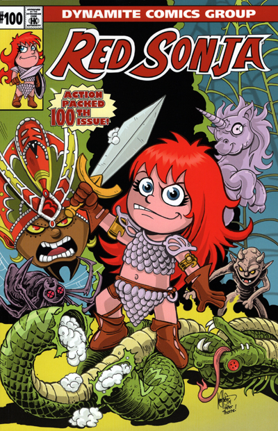 - commentary: The Gail Simone series of Red Sonja has a curious numbering from #0 to #18 and #100 and #1973. There are 18 core issues numbered #1 to #18, which ran somewhere between monthly and bimonthly from July, 2013 to September, 2015. A year into this, Dynamite issued a #0, as is often done to provide folks, who haven't been reading from the first issue, a synopsis that serves as an entry point to the remainder of the series. In February, 2015, Dynamite released this one-shot, labeled issue #100, to celebrate ten years of publishing Red Sonja comics. To our knowledge there is no math that actually sums to 100. In addition to the 80-issue run of Red Sonja: She-Devil with a Sword, there are many other 4-issue series, annuals and one-shots, so that the sum of Red Sonja books by Dynamite at that time was much greater than one hundred. In any case, there were five covers to this special issue #100. The most kid-friendly cover, by Ken Haeser, is shown here. This cover is an homage to Frank Thorne's cover to the first issue of Marvel's Red Sonja: She-Devil with a Sword, published in January, 1977. (As an aside, Mel Rubi's homage to the same cover is shown in the second entry to A Red Sonja Cover Gallery XVI: Mythological Beasts.) To close out the accounting, in July, 2015, there was also an issue #1973, to commemorate Red Sonja's first appearance in comic form in February, 1973 in the Marvel series Conan the Barbarian #23.