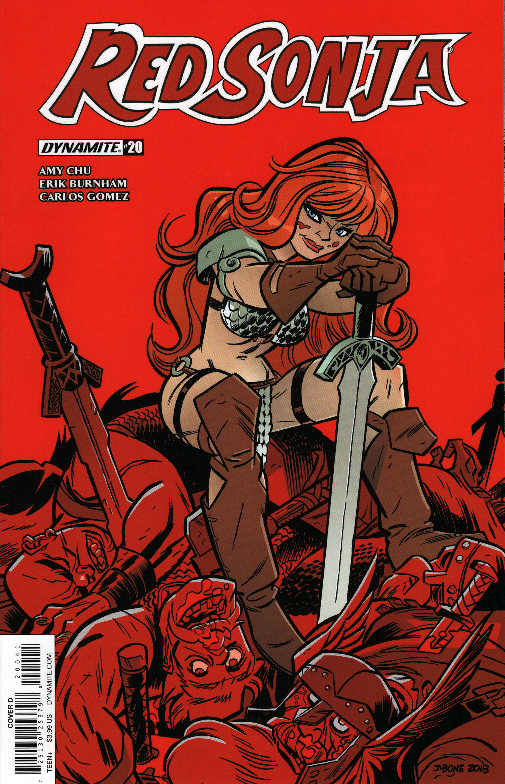 - commentary: While this cover features Red Sonja atop a mountain of her fallen foes, the style is reminiscient of the kid-friendly style that J. Bone used on all the covers of DC Super Friends (2008).