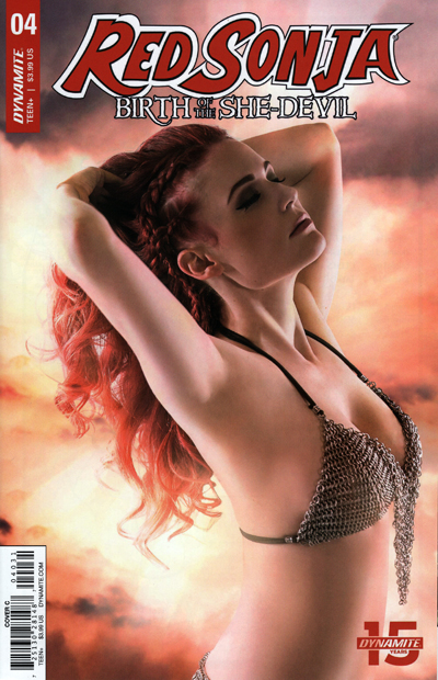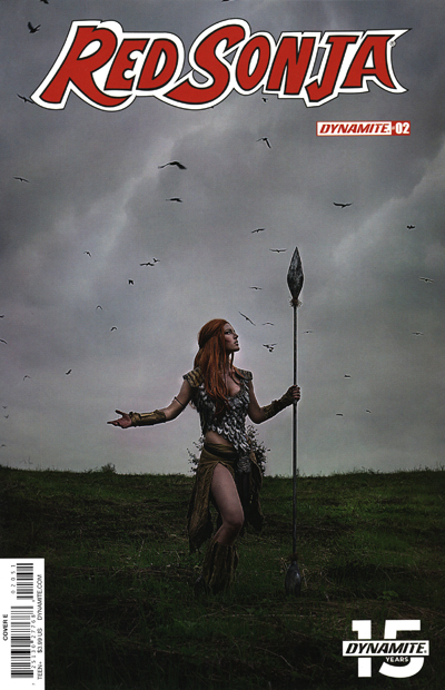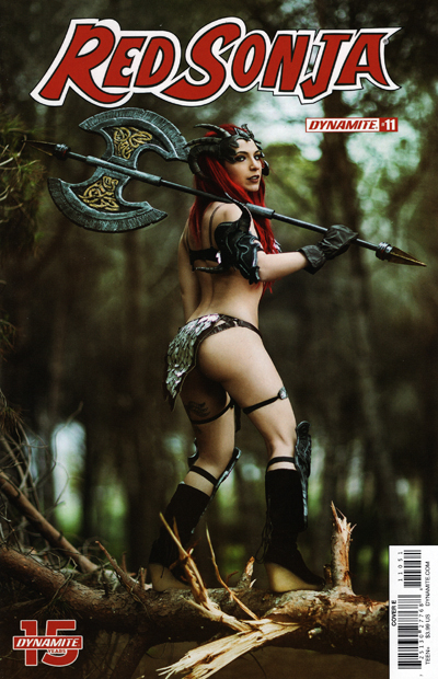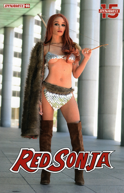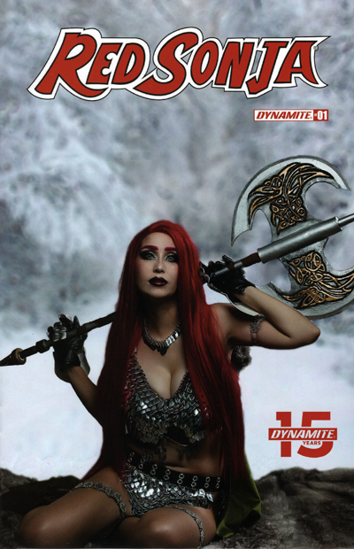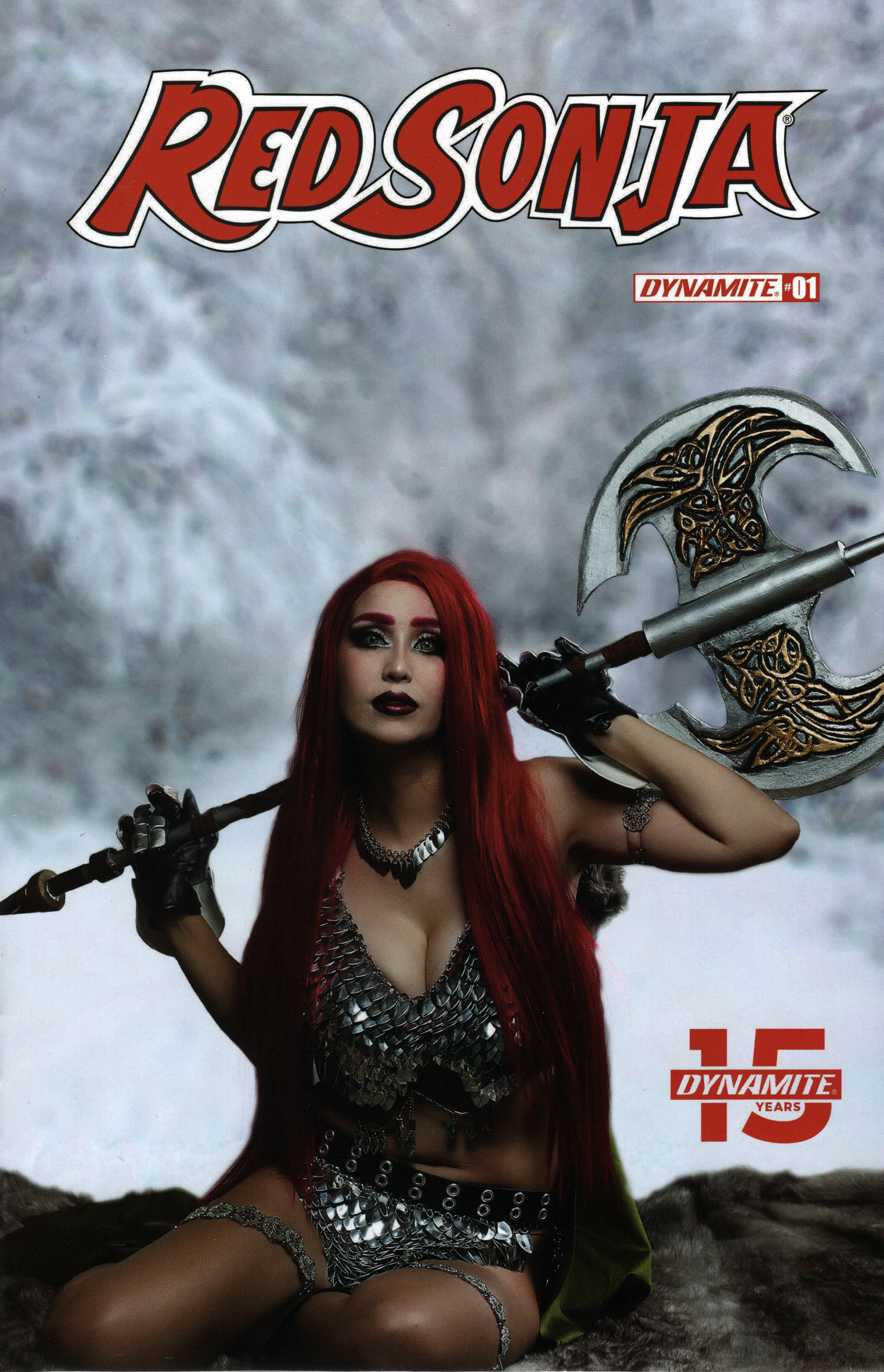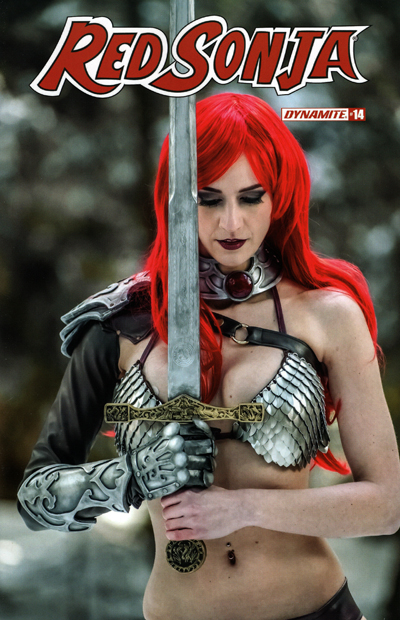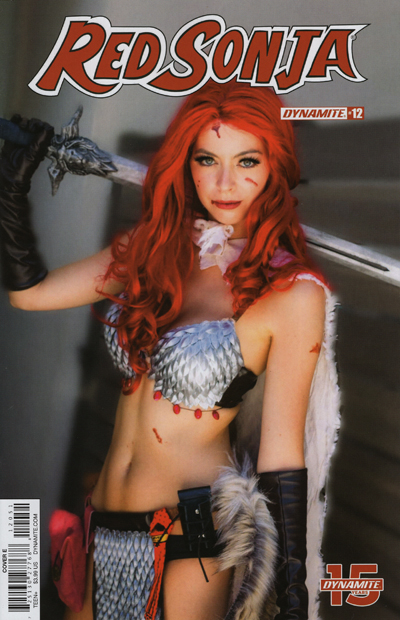 - commentary: In the 2019 interpretation of Red Sonja by Mark Russell, Dynamite continued to have a cosplay variant cover for each issue of the series. This cover from the debut issue is not the regular cosplay cover but a second retailer exclusive to Stadium Comics. Alyssa Stargoddess provides another look for Red Sonja seated on a bear skin in a wintry landscape.