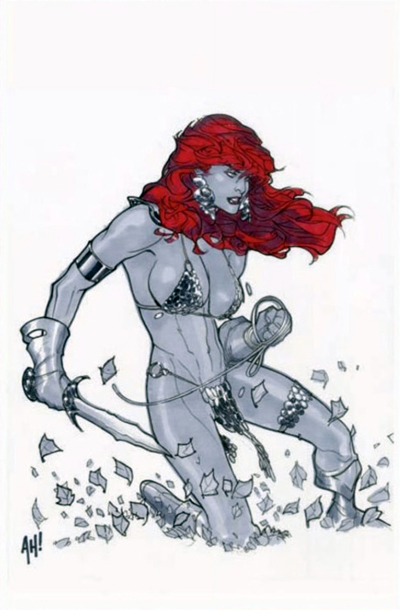 - commentary: Of all the variant covers to the eighty issues of Red Sonja: She-Devil with a Sword (2005), to our knowledge we are missing just two with unique art. (By this we mean to exclude virgin variants or tinted variants or sketch variants, etc.) This cover by Hughes is the first of them. We see it for sale periodically, at a price point that is unappealing to us.