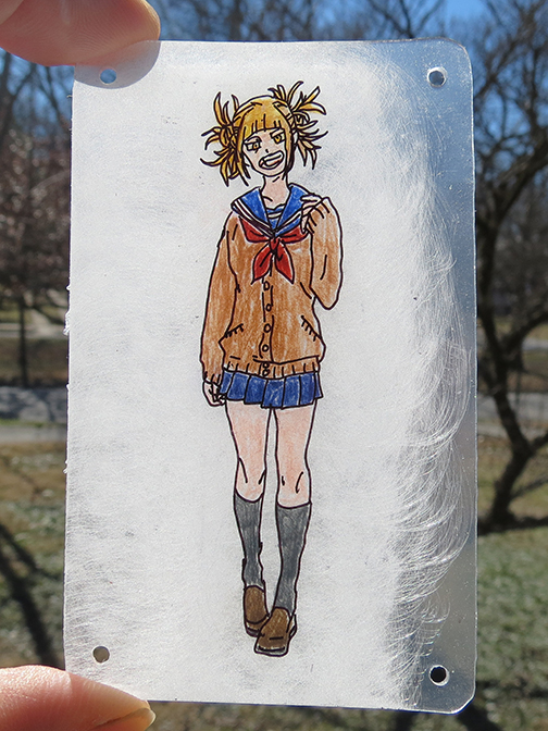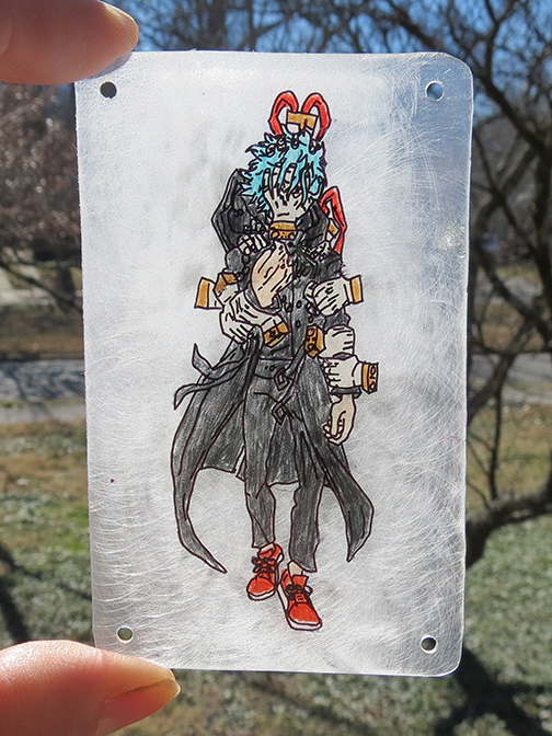 The staff of the Poison Pie Publishing House continue their art project in which they render scenes from beloved media in shrinky dink form. One member of the PPPH staff has a friend who is a fan of the manga, My Hero Academia. This gallery features a mobile with four characters. This work was created by Ruth Marie Keffer.