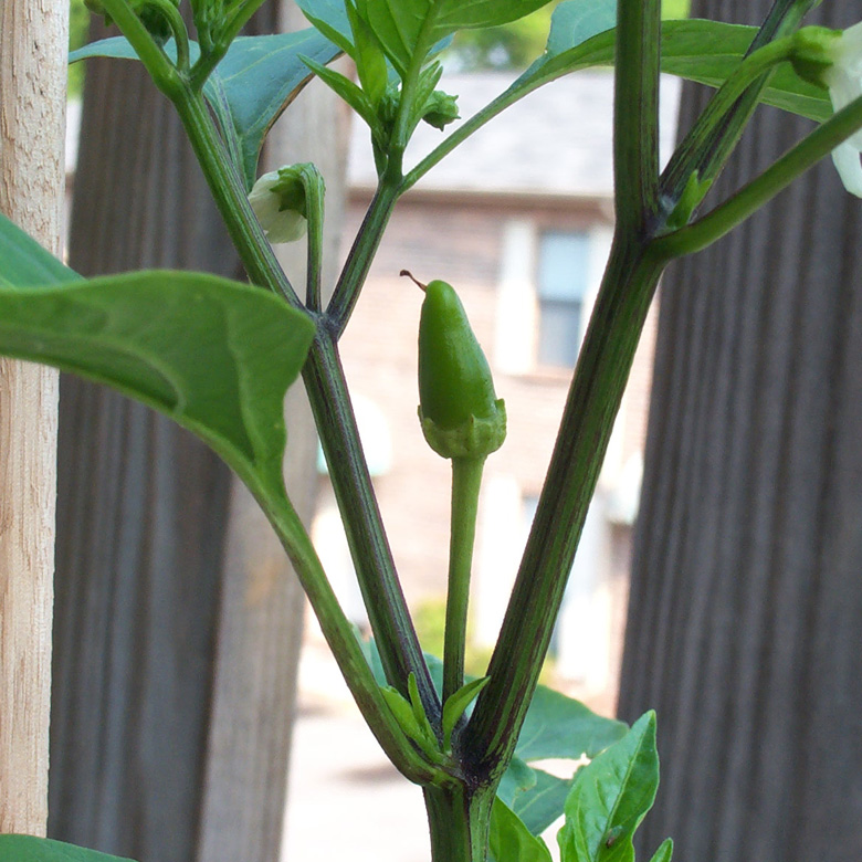 This is a picture of the first banana pepper from our garden this year. It's not ripe at the time the picture was taken. Eventually, we took it to Chicago and ate it on a pizza.