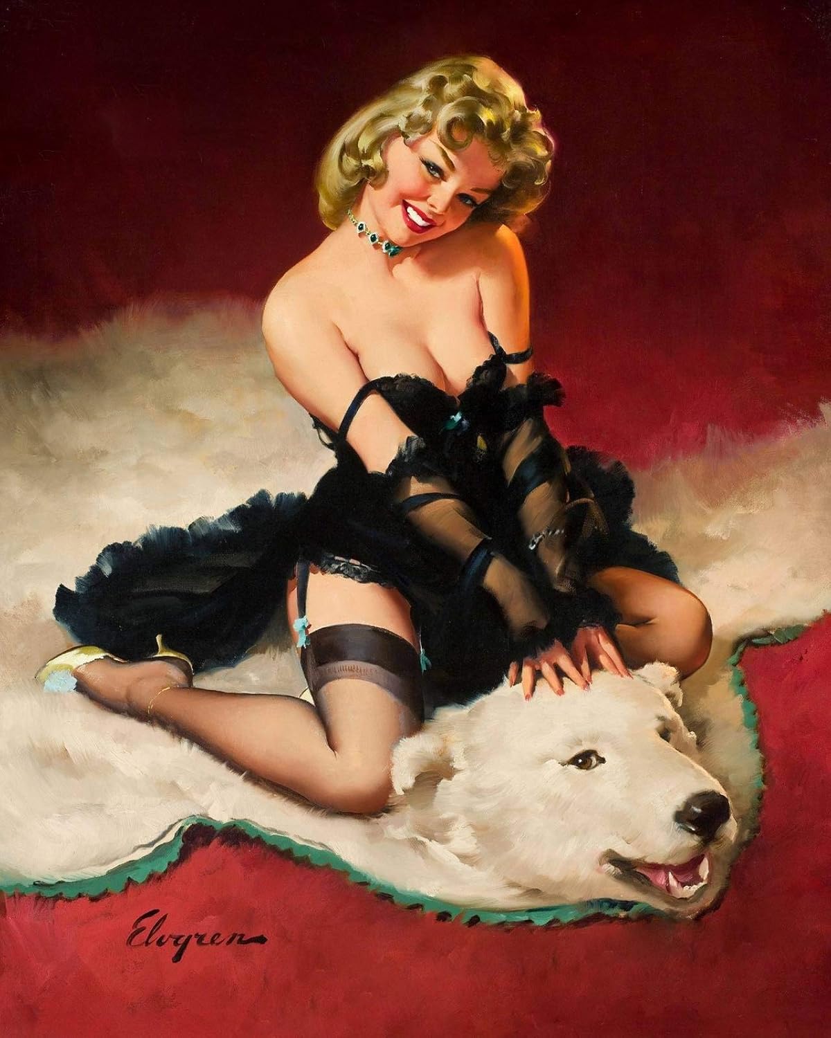- commentary: The portrait of Red Sonja reclining on bear skin rug harkens to old tropes of pin-up girls.