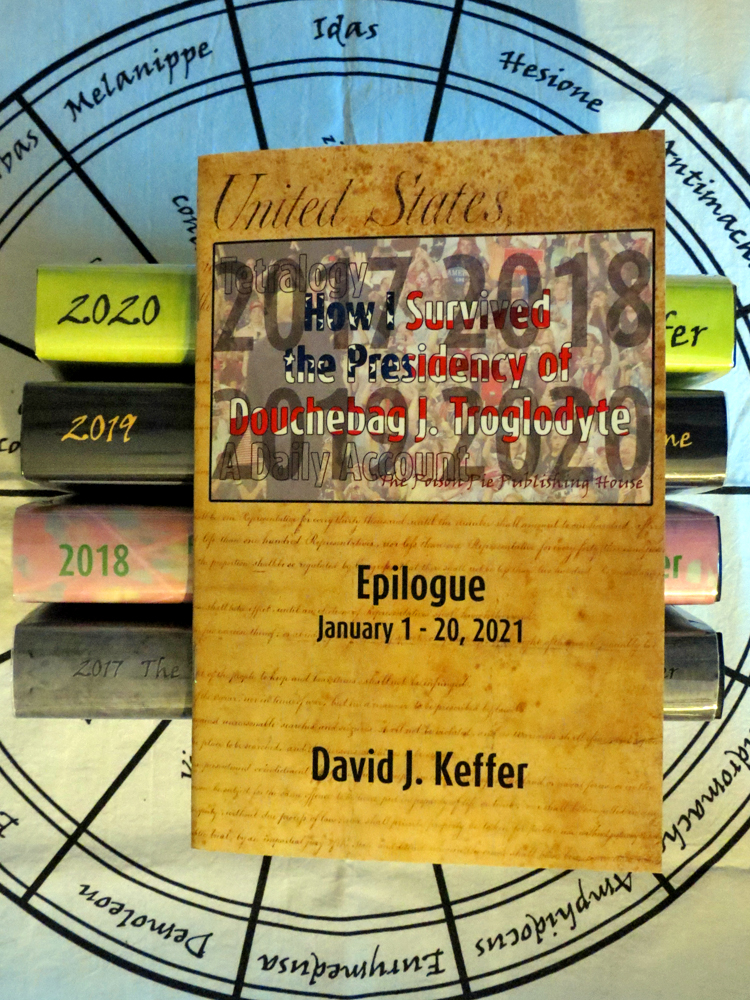 Today, with the inauguration of Joe Biden as President of the United States of America, the writing of the tetralogy, How I Survived the Presidency of Douchebag J. Troglodyte: A Daily Account has been completed. 1,481 daily passages were written beginning on January 1, 2017 and ending today, January 20, 2021. The tetralogy produced four books corresponding to the writings completed in years 2017, 2018 2019 and 2020, respectively. An epilogue, in the form of a reflective essay, occupied the first twenty days of 2021. All content is available via free, anonymous access. This work was generated via a non-idiomatic, improvisational creative process. It also demonstrates the writing-as-listening process. For more information, see the four brief introductory notes to the tetralogy.