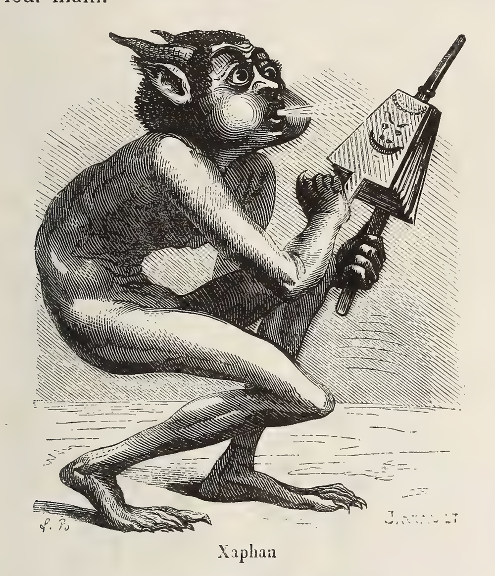 Xaphan, démon du second ordre. Quand Satan et ses anges se révoltèrent contre Dieu, Xaphan se joignit aux mécontents, et il en fut bien reçu, car il avait l'esprit inventif. Il proposa aux rebelles de mettre le feu dans le ciel; mais il fut précipité avec les autres au fond de l'abîme, où il est continuellement occupé à souffler la braise des fourneaux avec sa bouche et ses mains. Il a pour emblème un soufflet.